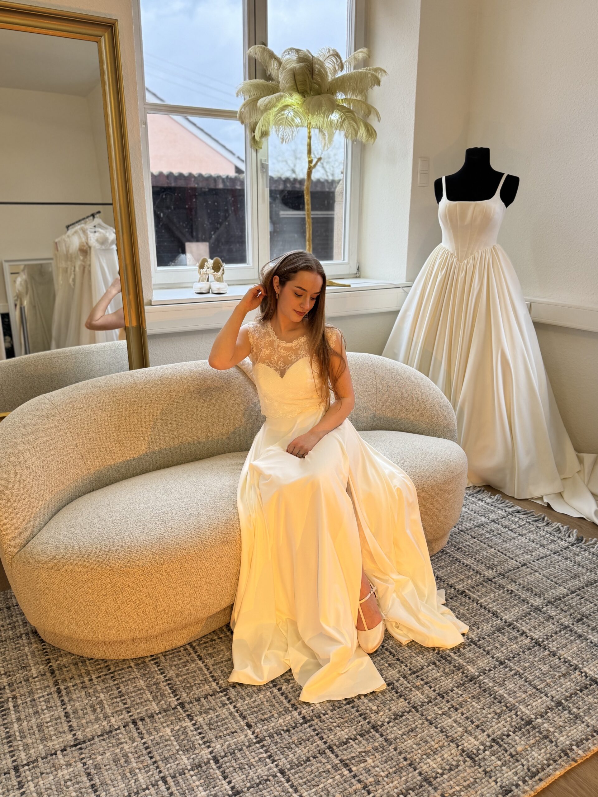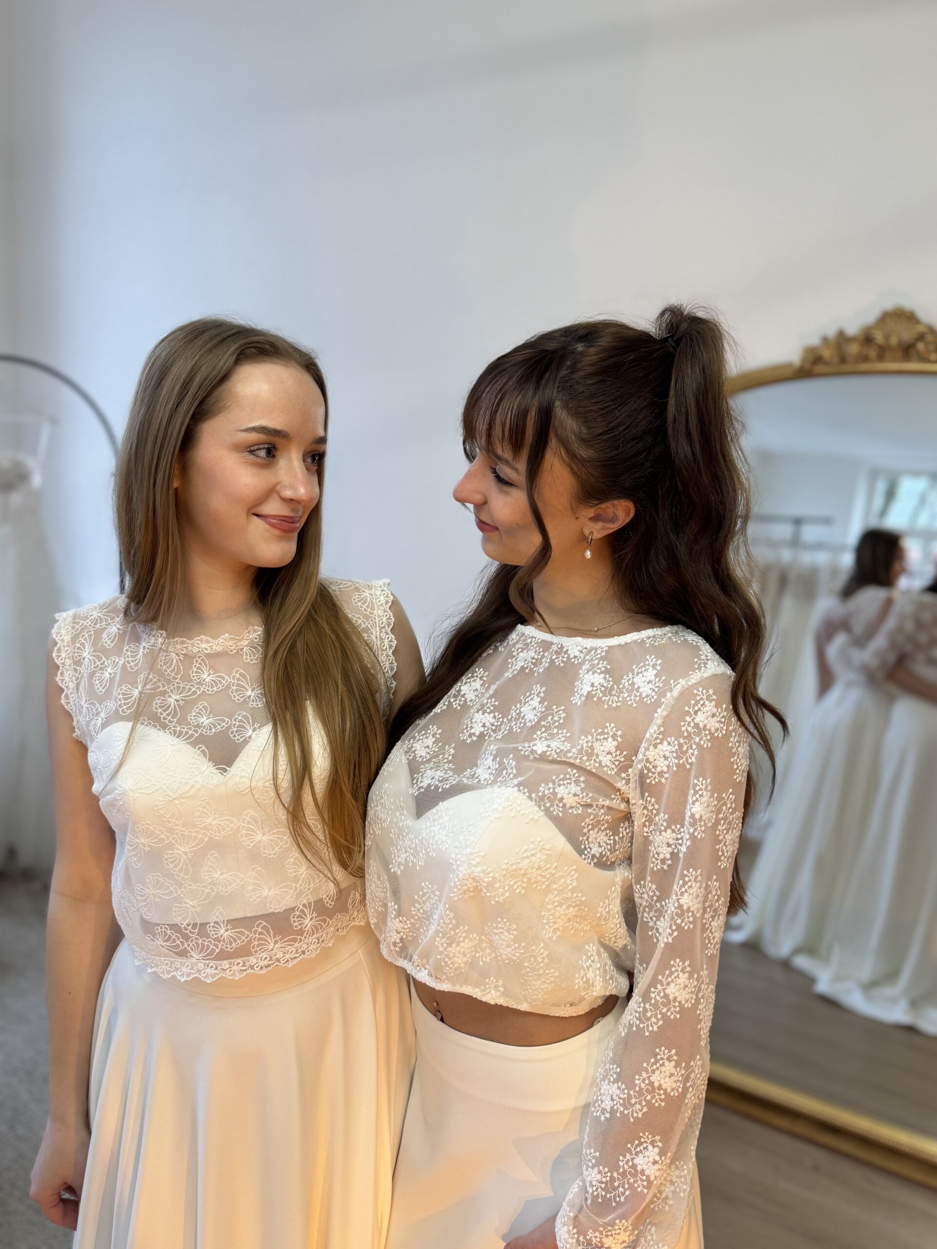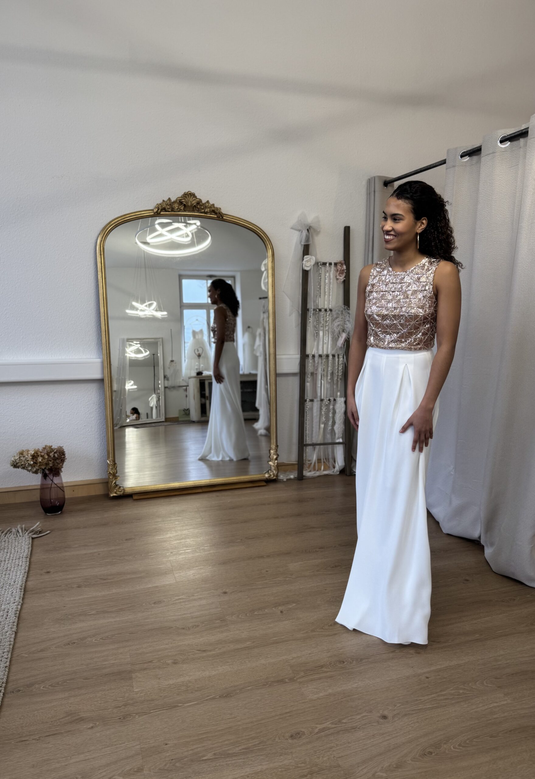 Viele unserer Outfits funktionieren nicht nur für den Standesamtmoment, sondern auch perfekt für die Party am Abend – so kannst du deinen Tag in zwei Looks genießen, die beide deine Persönlichkeit widerspiegeln.